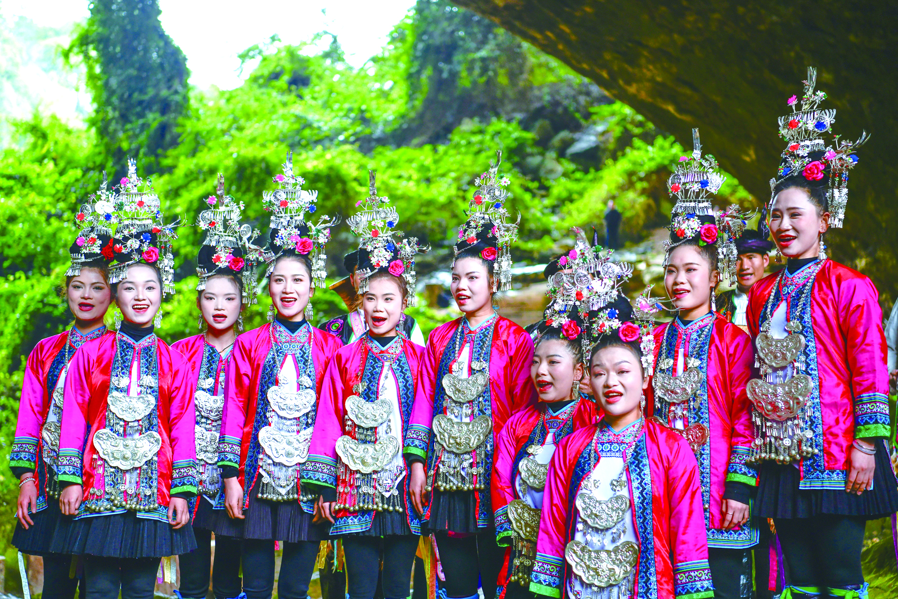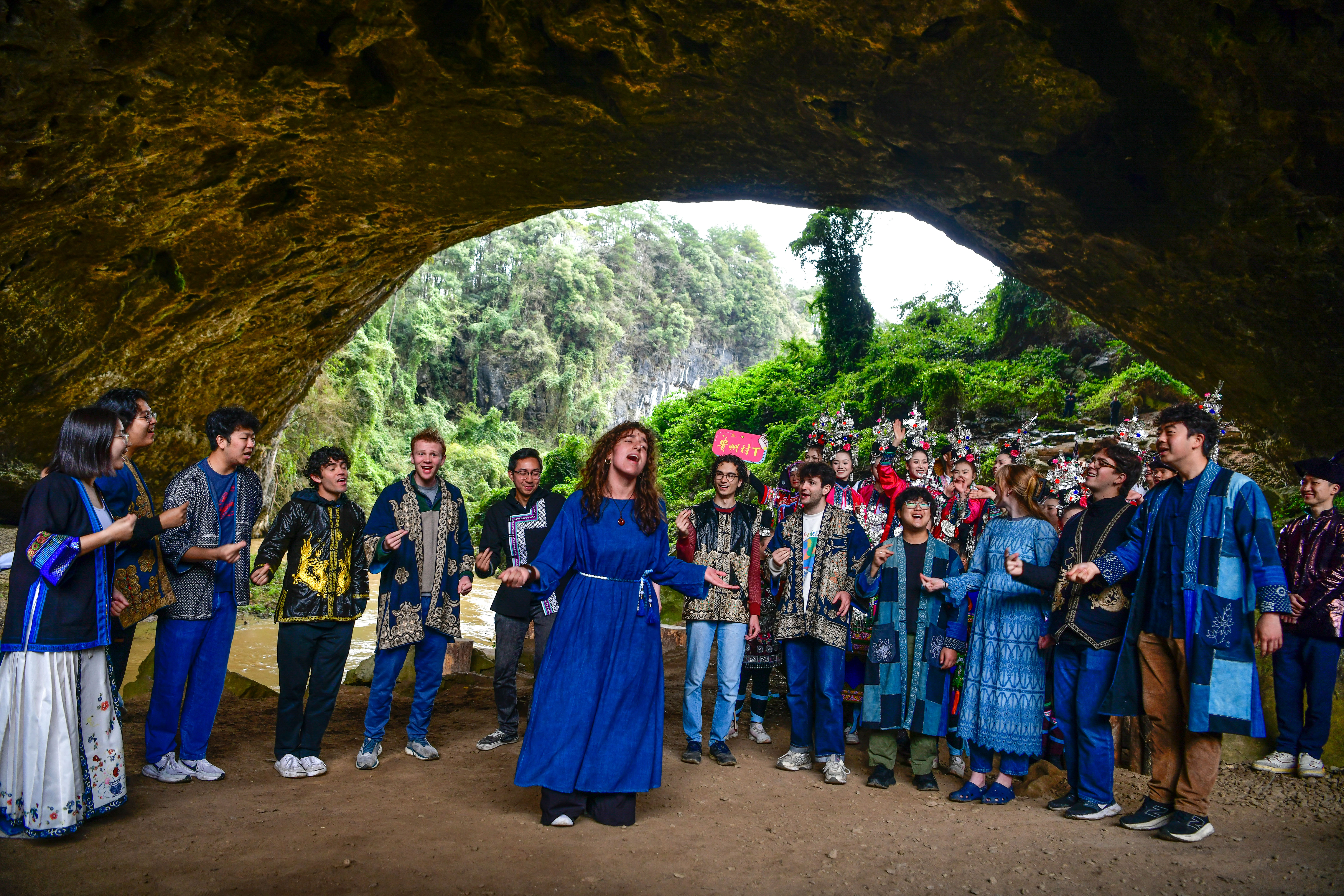 在黎平县天生桥景区,中美青年深情和鸣。新华社记者杨文斌摄